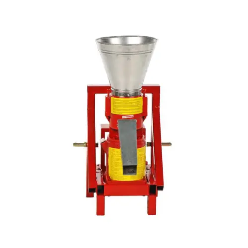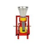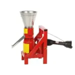 Le remplissage du matériau s’effectue simplement par la trémie supérieure, tandis que les granulés finis sont évacués latéralement via une goulotte d’éjection pratique. La machine est livrée avec une filière de 6 mm, permettant d’obtenir des pellets d’une longueur moyenne de 25 à 35 mm, avec un rendement horaire de 50 à 90 kg selon le matériau utilisé.