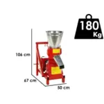 La sortie latérale permet une évacuation fluide du pellet fini, d’une longueur moyenne de 25 à 35 mm. Selon le type de matière première utilisée, la production horaire varie entre 90 et 110 kg/h, ce qui en fait une solution idéale pour les particuliers, agriculteurs et petites exploitations souhaitant produire leur propre combustible.
